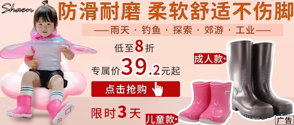 儿时第一次拥有雨鞋时,迫不及待往地上泼盆水,穿上鞋子蹦蹦跳跳,然后就是期待下雨。厂家雨鞋寄到,感叹时光流逝也感慨技术水平提高。雨鞋比幼时更好看柔软,每个细节都很到位,鞋底防滑厚度适中,优质PVC鞋底轻松折90°。厂家寄样几十双,经数月检测试穿,最终上架儿童2款、成人4款及工业重工1款(鞋头嵌入防砸钢头保护脚趾),不论雨天或户外郊游垂钓、孩子上学或亲子活动、园艺探险或工种需要,总能解燃眉之急。上新低至8折,限时3天,戳图速抢!