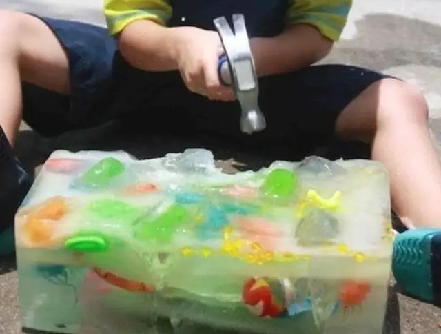 找一个公主玩具,男孩子不喜欢公主玩具的话,可以拿自己喜欢的玩具,能泡在水里的那种,比如乐高小人等等。把玩具冻在一个大冰块里,比如,把公主玩具装在饭盒里,装满水,放到冰箱冷冻室里。告诉孩子公主被施了魔法啦,需要孩子想办法把公主救出来。