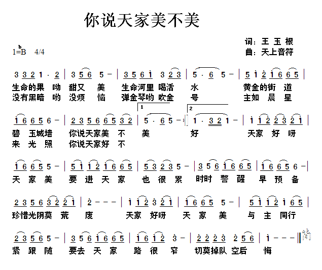 +- 首页 赞美诗歌 正文 音频播放地址: 视频播放地址: Youtube播放地址: 生命的果哟甜又美 生命河里喝活水 黄金的街道碧玉城墙 你说天家美不美 没有黑暗哟没烦恼 弹金琴又吹金号 主如晨星来光照 你说天家好不好 天家好呀天家美 要进天家也很累 时时警醒早预备 珍惜光阴莫荒废 天家好呀天家美 与Z同行紧跟随 要去天家路很窄 切莫掉队空后悔 歌谱: 赞美诗歌未整理以斯拉盛晓玫祝瑞莲生命河灵粮堂小羊诗歌Jesus Image天韵合唱团新酒使命团我心旋律JLSS BlessedThe Hope佳音 赞美之门 收藏 分享 链接