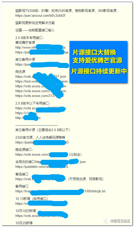 昨天「猫影视TV2.0.8」专用接口失效了,今天王者归来,比之前的2345官源、360影视官源、搜狗影视官源更加厉害,这次支持爱优腾芒官源,附2个专用接口,备用接口无数。