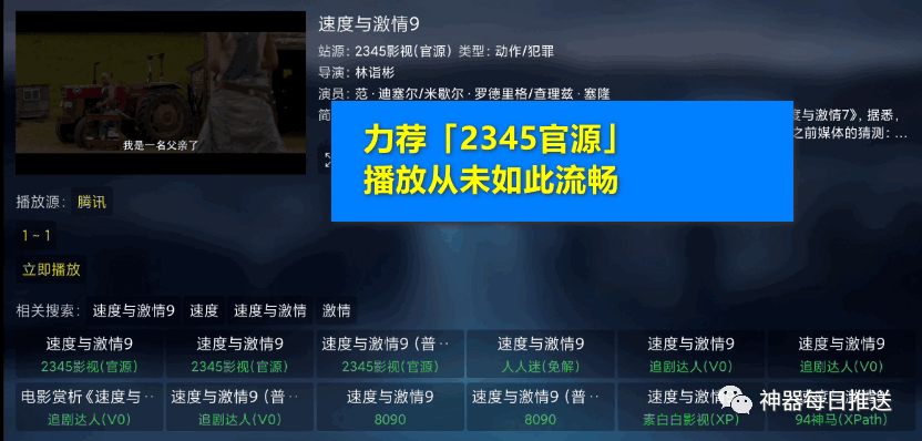 这个专用聚合源支持2345影视官源、搜狗影视官源、360影视官源、人人迷免解源,基本是秒播,超级流畅。