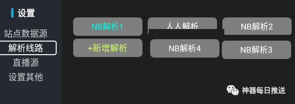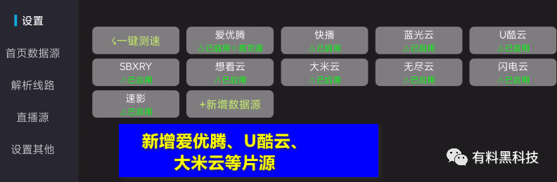 主力影视源包括:爱优腾、快播、蓝光云、U酷云、大米云、无尽云、闪电云等等片源,总计10个片源。片源解析线路比较多,有5条解析线路。