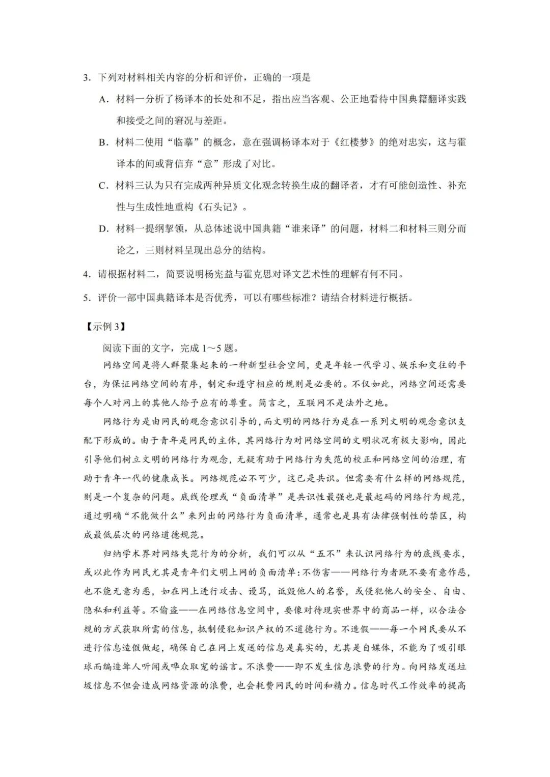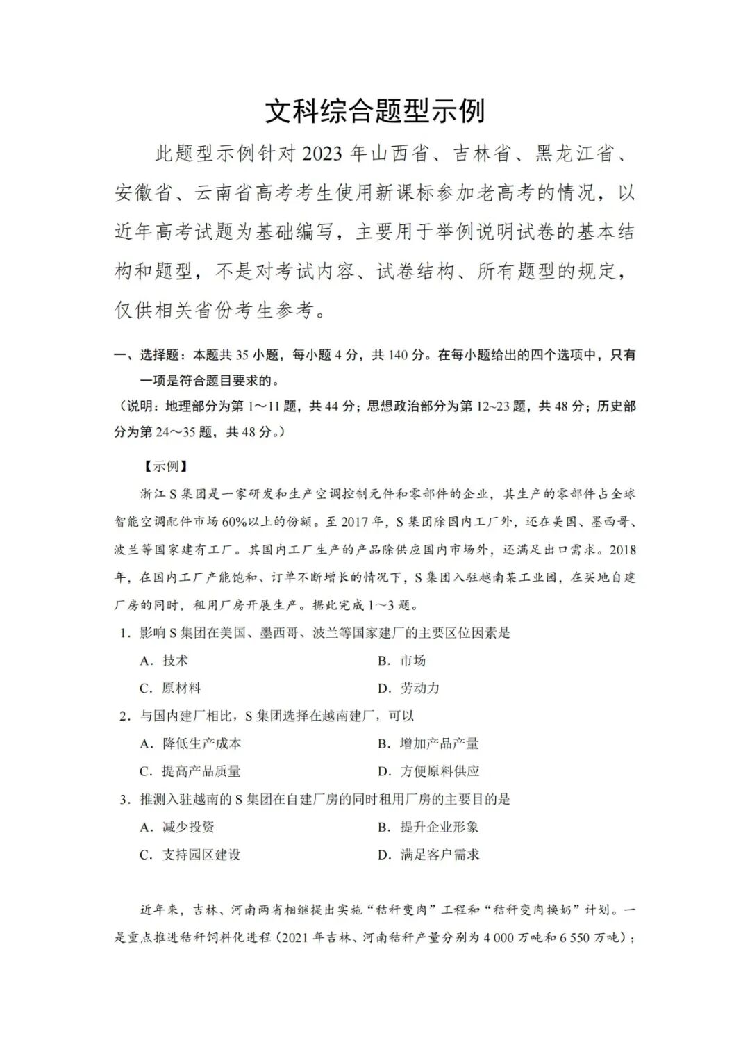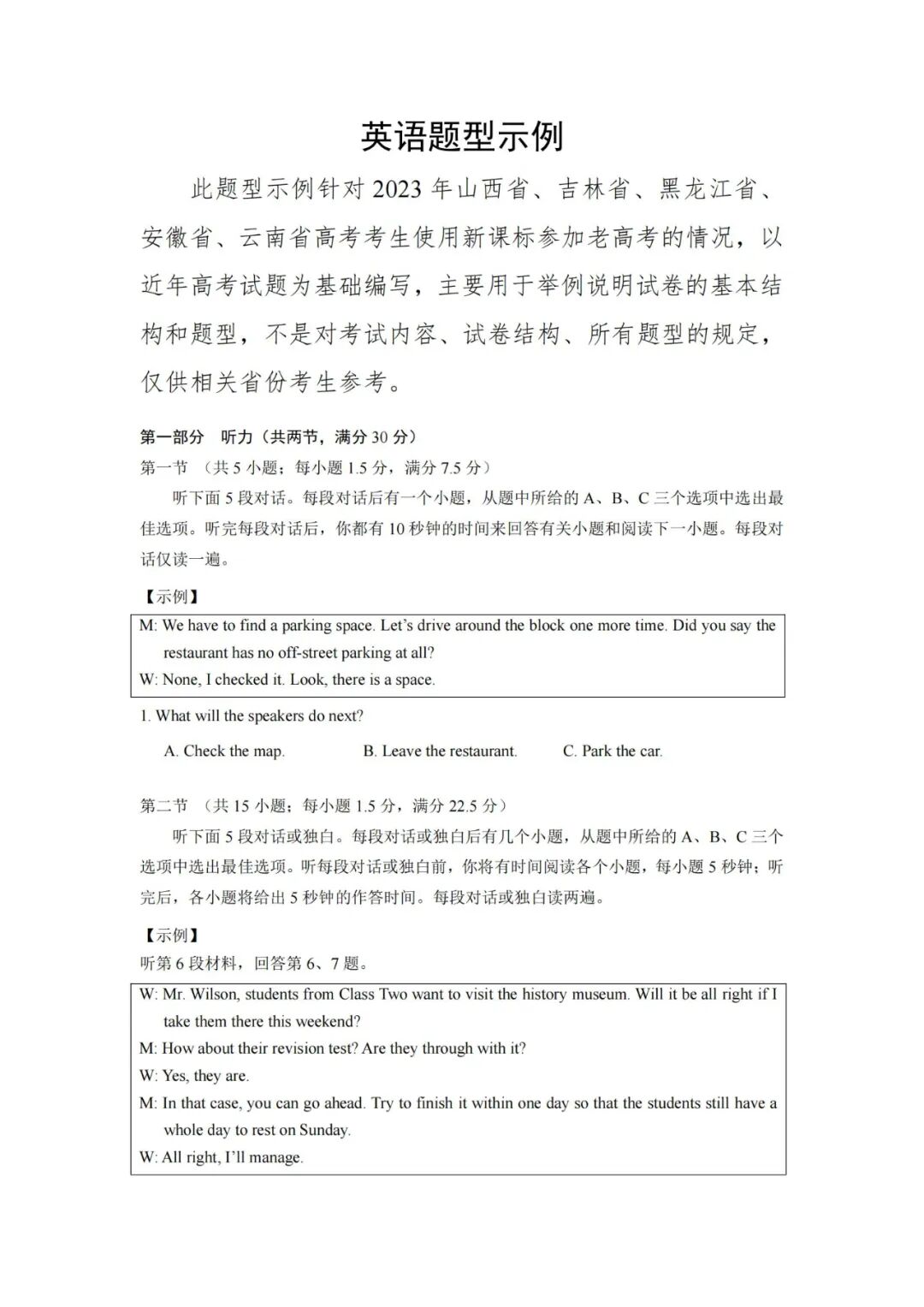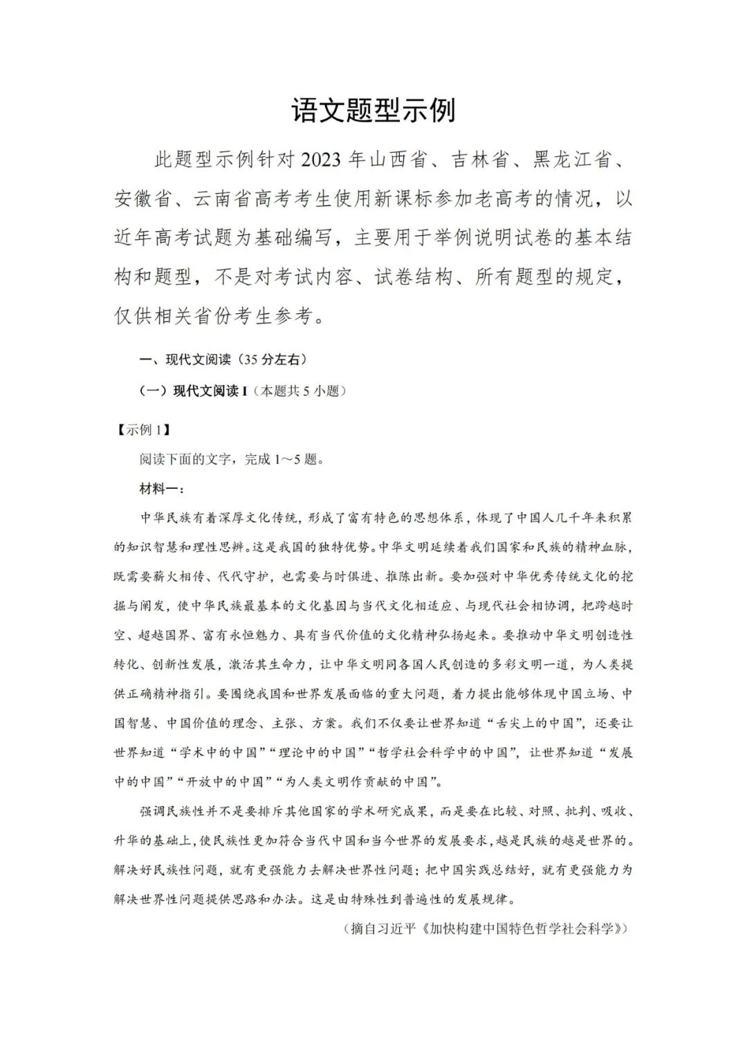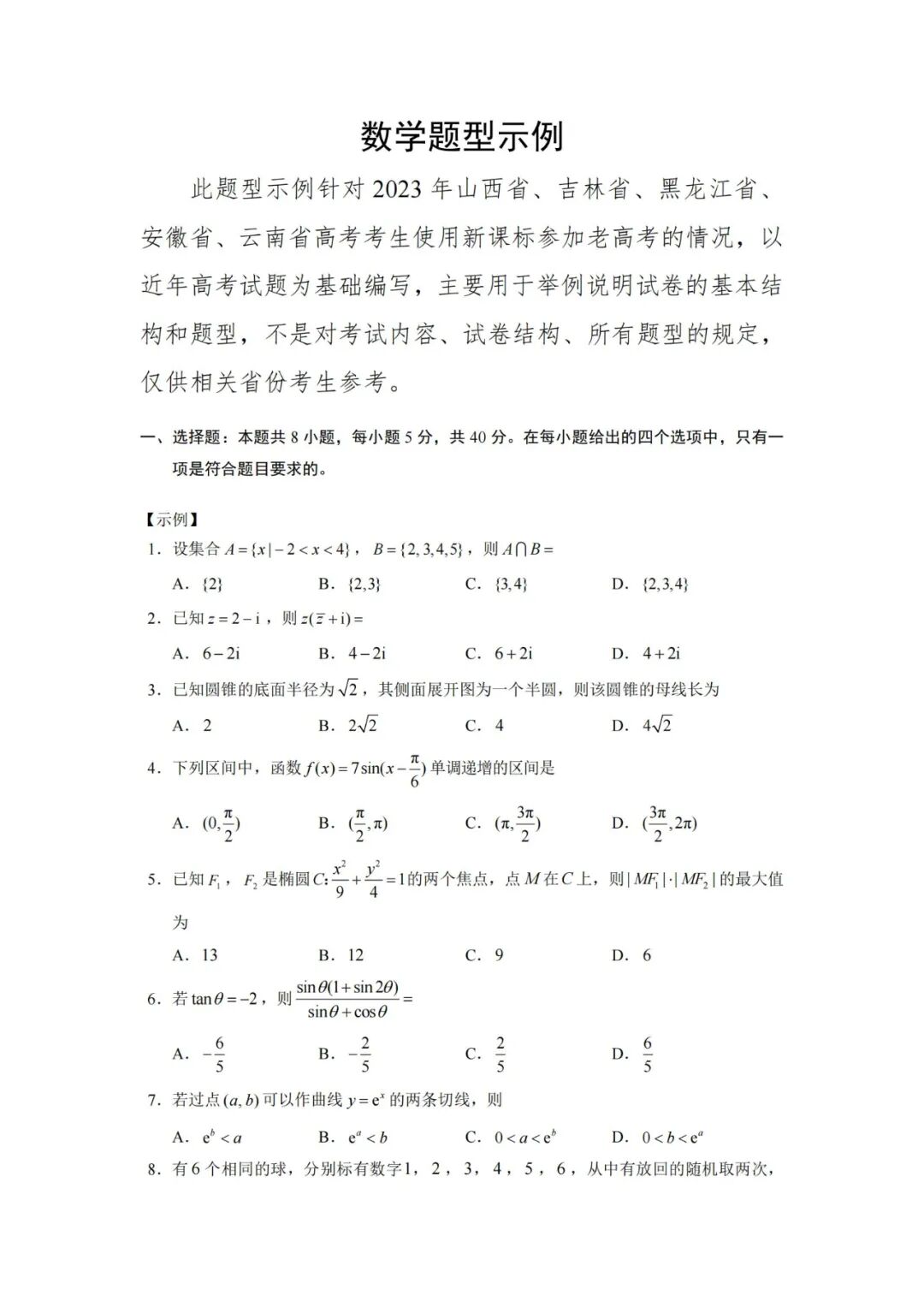 众所周知,根据规定,2019之后,新高考不再出考纲和题型示例,但因2023高考有五个省是新课标又是老高考,因此,教育部国家考试院编写了语数英三门学科高考题型示例。同时说明,:题型示例的选编只做举例说明,并不代表高考最终题型。但这些题型样例,参考性强,有助于高考命题倾向性的研究。我们认识到,命题的依据是《高考评价体系》和"高中新课标”,将遵循"命题核心价值金线,能力素养银钱,情境载体串联线"具体命题思想,每道试题均会“无价值,不入题;无思维,不命题;无情境,不成题"。教育部以此加大试题区分度,增强选拔功能。