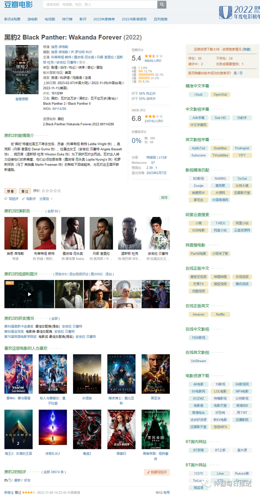打开豆瓣电影的详情页就会看到右侧侧边栏的资源站自动检索信息,显示绿色按钮的表示当前条目下该资源站可用。
