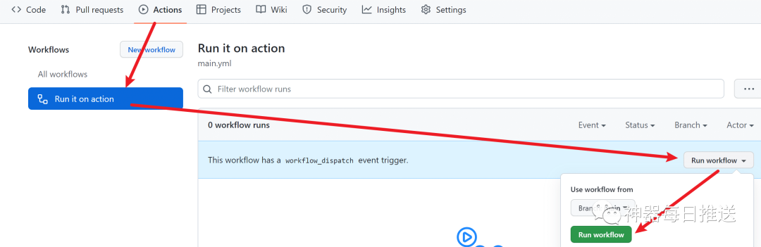 在Actions页面,按照截图步骤调试,提示Workflow run was successfully requested.,就说明代码跑通了,然后就是更改一些Actions变量了。