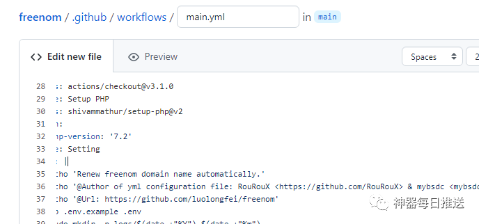 3、 复制以下内容到Actions文件创建页面,可以适当修改Cron定时任务的时间