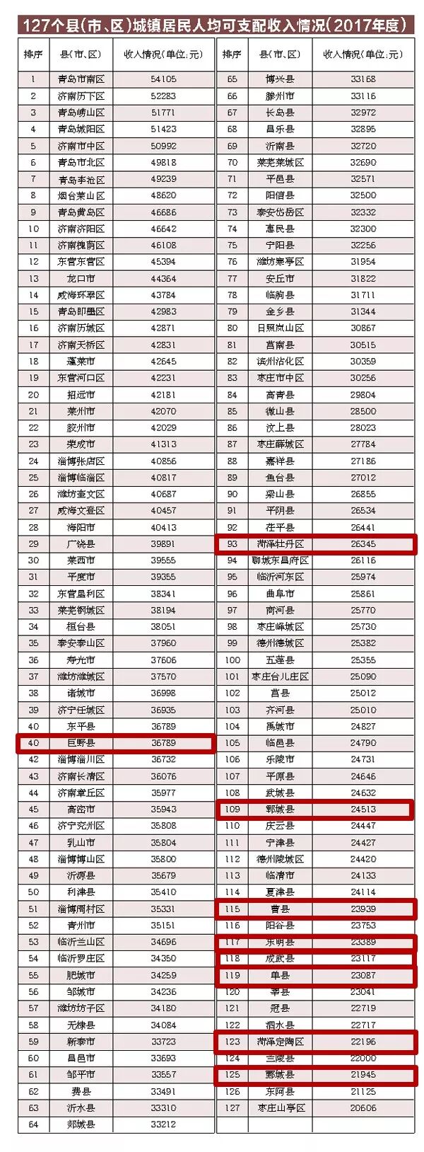 在有统计数据的127个县(市、区)中,2017年度城镇居民人均可支配收入超过5万元的地域有5个。其中,青岛市南区2017年度城镇居民人均可支配收入保持平稳增长,达到54105元位居山东首位;菏泽市巨野县2017年度城镇居民人均可支配收入为36789元,位居全省第40位菏泽市第一位。